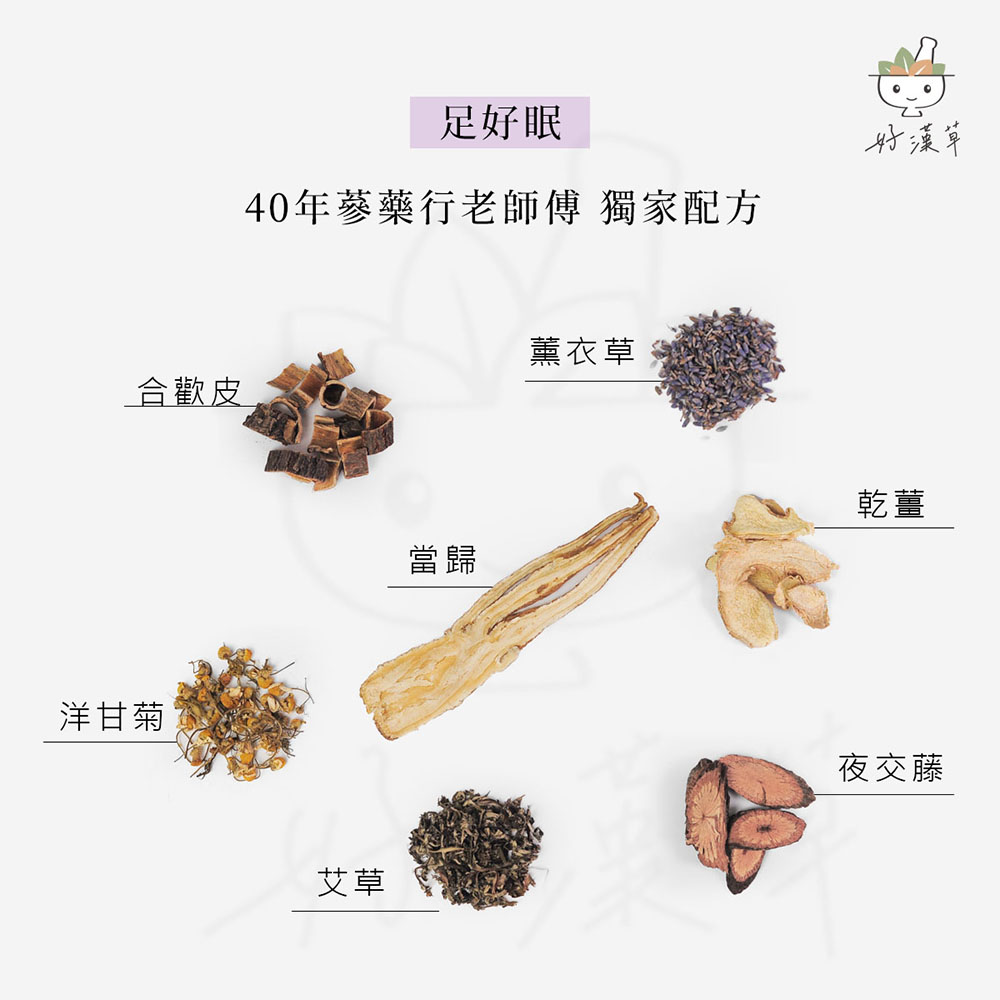 【足好眠】成分:當歸、艾草、合歡皮、夜交藤、薰衣草、乾薑、洋甘菊