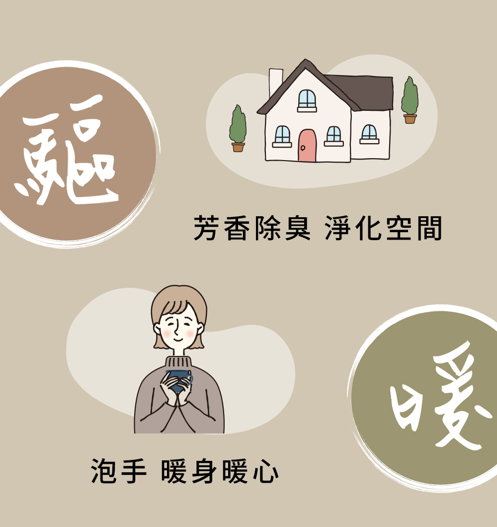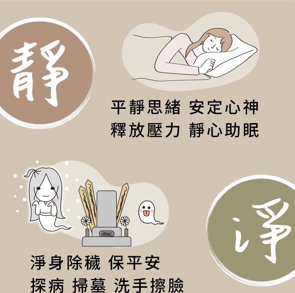 配方中的天然草本植物如艾草、藿香、白芷、丁香、紫蘇、香茅、石菖蒲等,皆有助於平衡身心,讓你擺脫壓力和疲勞,享受平靜和舒適的感覺。