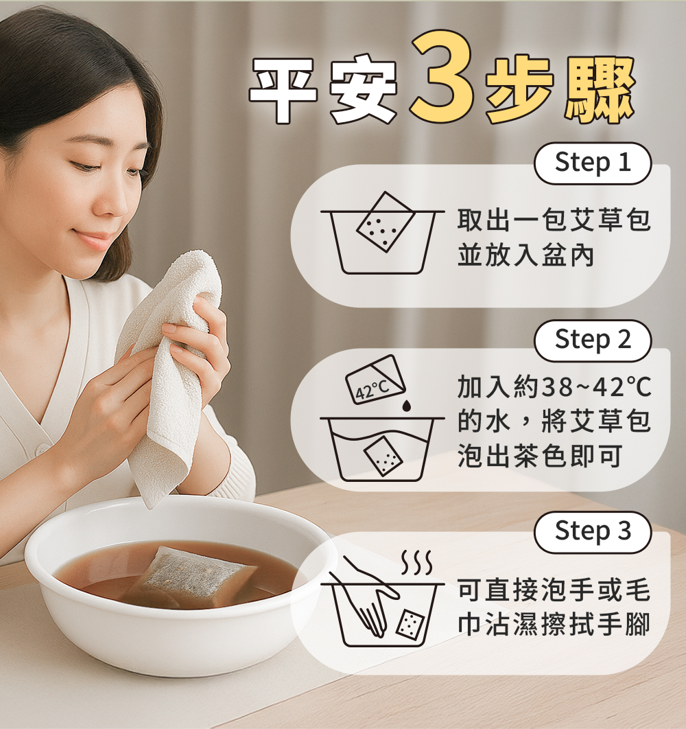 將艾草包放入一個容器中,加入熱水浸泡5-10分鐘,待水溫稍降後,將手浸入其中,感受艾草的溫熱與香氣包圍雙手,能有效驅寒,帶來舒適放鬆的感覺。