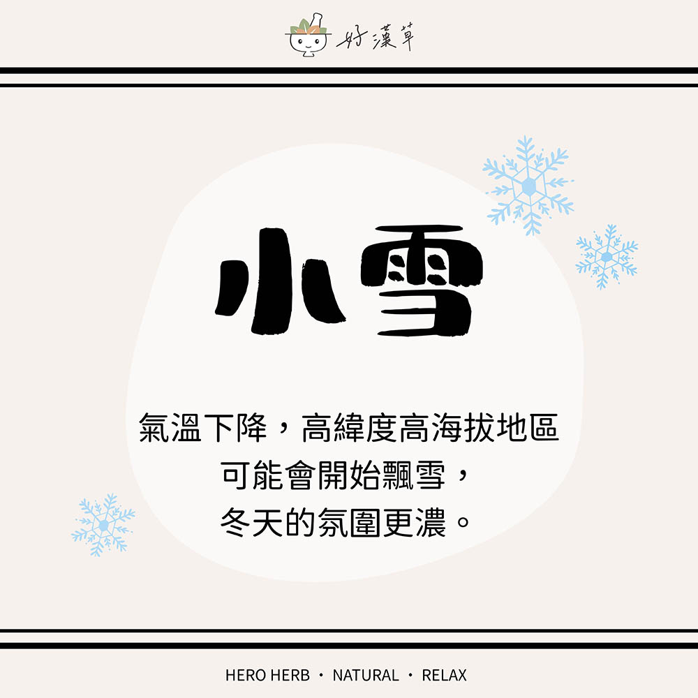 「小雪」是冬季的第二個節氣,代表著氣溫將開始明顯下降,但尚未達到嚴寒的程度。古人觀察到此時「氣寒而將雪」,雖地氣未寒,但雨水已凝結成雪花。在這段時間,養生的重點在於「防寒保暖」與「收藏陽氣」,透過飲食與作息的調整,為深冬打好健康的基礎。