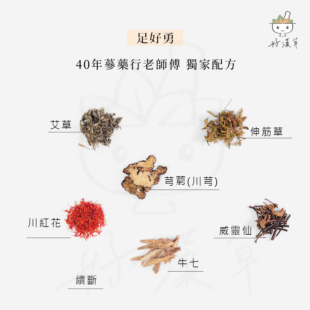 【足好勇】成分:威靈仙、川紅花、伸筋草、牛七、川芎、續斷、艾草