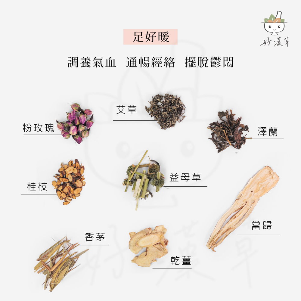 【足好暖】成分:益母草、艾草、當歸、桂枝、乾薑、玫瑰、澤蘭